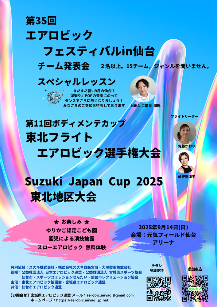 ◆ 2025年の大会チラシ ※画像クリックで拡大されます ◆ 2025年 大会に関わるお知らせ 大会案内 2025 スケジュール2025 東北フライト 選手リスト 東北フライト(over65.60.50.30.16)場ミリ 東北フライト(小学生 . 中学生)場ミリ 発表会演技順番 発表会提出物 「第11回東北フライトエアロビック選手権大会」大会結果 小学生 中学生 over16生 over30 over50 over60 over65 トライアル 東北フライト入賞者【小学生】 東北フライト入賞者【中学生】 ◆ 練習会 フライト練習会、オリジナルレッスン、パーソナルチェック ※画像タップで拡大されます 上記のQRコードをクリックもしくは読み取って、申し込みフォームをご入力ください。